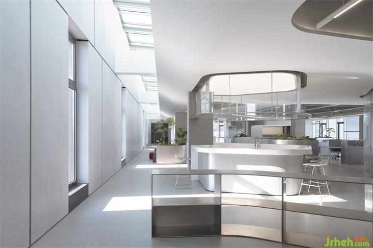 室內(nèi)采用簡(jiǎn)潔的材料,公共區(qū)域鋪設(shè)人造石地板,辦公和研發(fā)空間鋪設(shè)地毯,便于未來(lái)靈活布置。大部分垂直表面采用金屬、石材和玻璃材料,天花板保持干凈裸露,以創(chuàng)造高度和空間靈活性。所有的室內(nèi)隔斷、滑動(dòng)門(mén)、嵌入式櫥柜都采用的是柏麗和德祿自己的產(chǎn)品。我們的想法便是,研發(fā)中心的內(nèi)部工作空間同時(shí)也是一個(gè)“現(xiàn)場(chǎng)展示廳”,員工們?cè)谧约涸O(shè)計(jì)和生產(chǎn)的產(chǎn)品間穿梭。