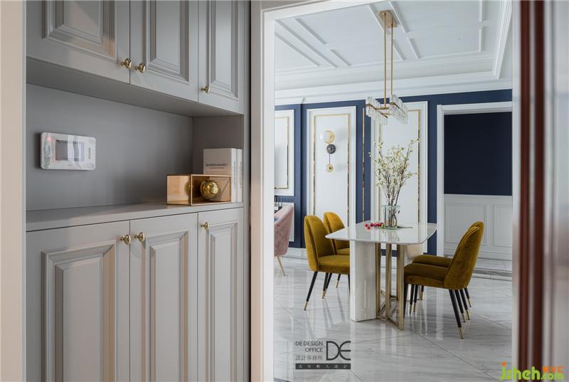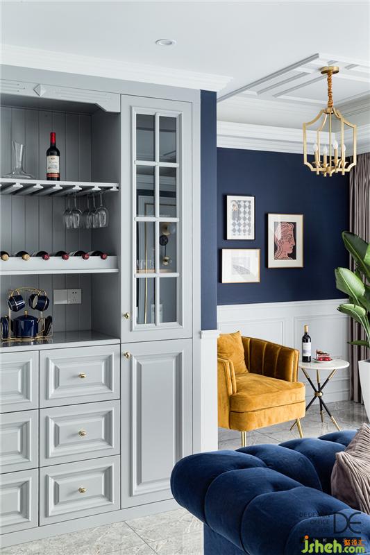 打開門,映入眼簾的便是一種時尚感。灰色的鞋柜,深藍色、白色與金色的撞色,讓空間色彩豐富卻絲毫不顯俗氣。