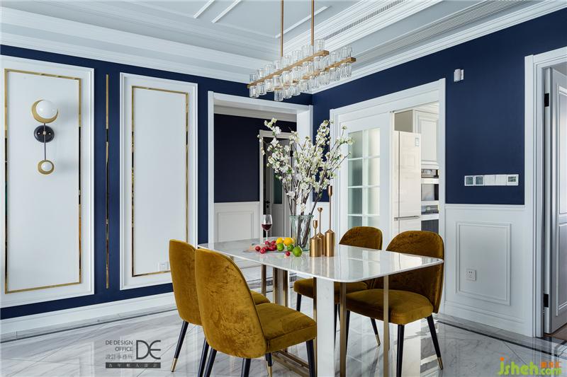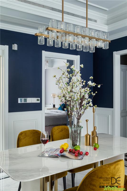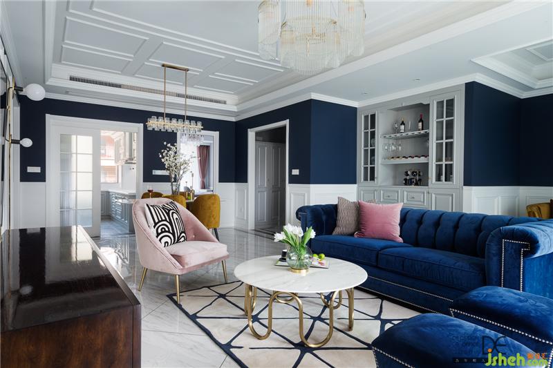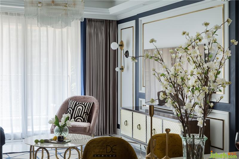 通透的采光將粉藍搭配的美發(fā)揮到極致,客廳以深灰色為主調(diào),部分墻面的藍色,與深藍沙發(fā)達到了統(tǒng)一,輕奢風(fēng)格的金屬元素,使浪漫精美的居室空間也不失輕快與活力。