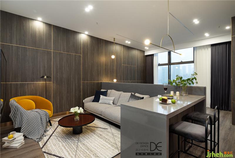 客廳是由吧臺(tái)和硬包床頭“圍起來(lái)”的空間,整體造型簡(jiǎn)潔,木飾面板+不銹鋼收口線,重慶設(shè)計(jì)師賦予了空間延伸感,讓空間不再局促。舒適的沙發(fā),氛圍恰當(dāng)?shù)拈喿x角,黃色單椅成為了點(diǎn)睛之筆。