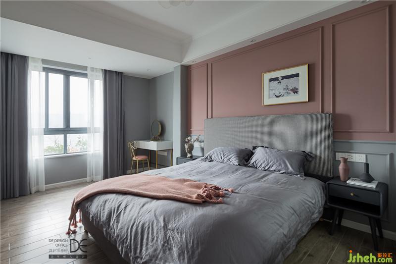 主臥的原木色木紋磚搭配灰色+臟粉色的背景墻,營造了一個(gè)溫馨舒適的睡眠空間。將原本的陽臺(tái)納入室內(nèi),不僅增加了臥室面積,更是引入了更多的光線,讓臥室變得更加柔和清透。