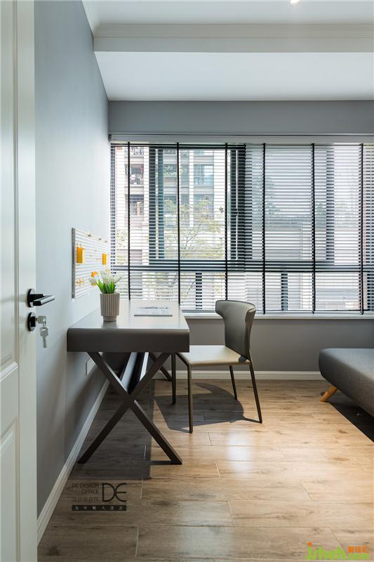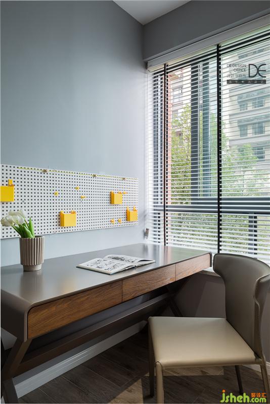 這個(gè)多功能空間可以根據(jù)需要切換,常見的形態(tài)是書房,必要時(shí)還可以將沙發(fā)展開變成床。為了將采光效果做到最佳,窗簾均采用了木百葉。