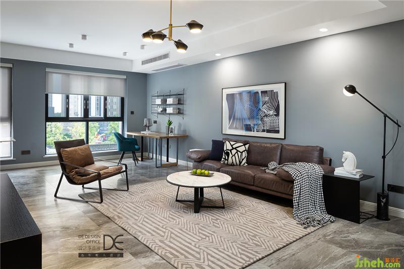 灰藍(lán)色的墻面與中灰色系的地面碰撞在一起,閑適中彰顯出屋主的穩(wěn)重,深咖色的沙發(fā)與黑色的邊幾是在活躍的硬裝設(shè)計(jì)上搭配的較為冷靜的軟裝配色,整個(gè)客廳宛如微風(fēng)吹拂下泛起縷縷漣漪的藍(lán)色大海。