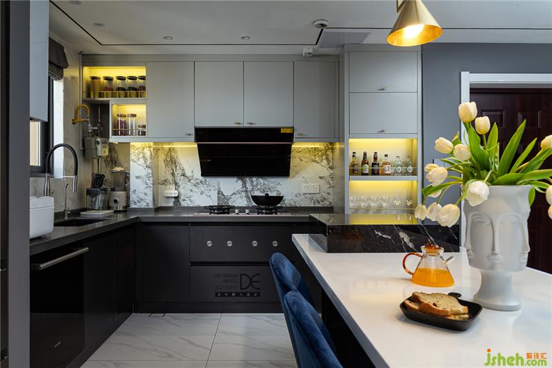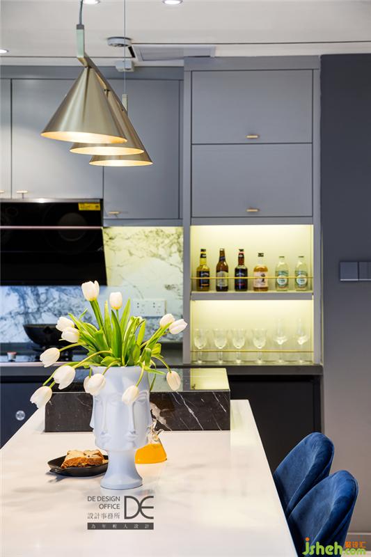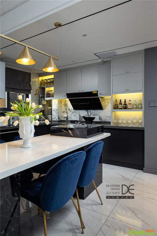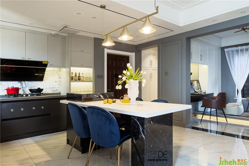 島臺(tái)和餐桌結(jié)合,黑色石材和白色石材相碰撞,配上藍(lán)色絲絨餐椅,讓餐廳既豐富多彩又恰到好處,就想和你在這里共進(jìn)晚餐。