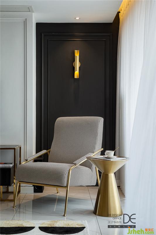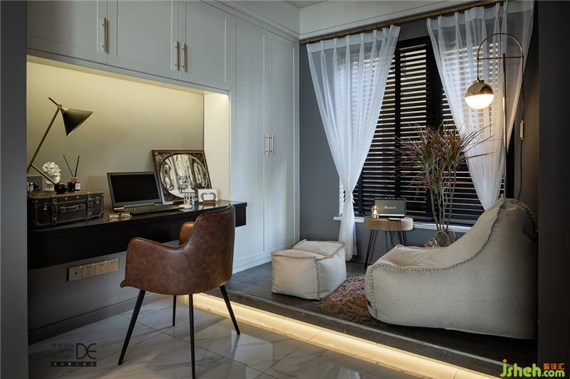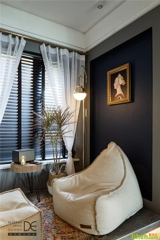 休閑角落以深藍(lán)色和灰色為主調(diào),落地?zé)羧岷偷墓?,加上百葉窗透出的絲絲光線,讓人只想在這里聽著音樂(lè)喝著咖啡,安安靜靜地享受精致的下午時(shí)光。