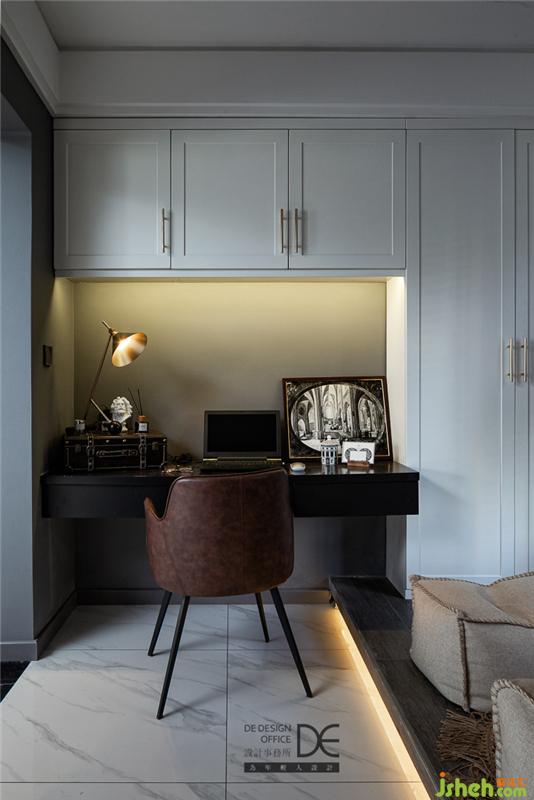 這里不僅有書房的功能,還保留了一個(gè)地臺(tái)作為休閑角落。設(shè)計(jì)師在地臺(tái)邊緣精心設(shè)計(jì)了燈帶,讓整個(gè)空間更具層次感的同時(shí),又增加了一絲浪漫之感。