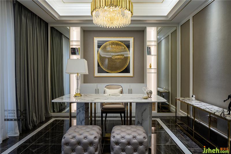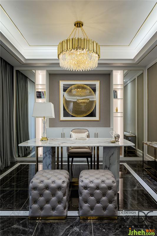 石材的大氣與金色掛畫的輕奢相結(jié)合,這里既是開放式書房又可以是商務(wù)洽談區(qū),為業(yè)主的事業(yè)助力。