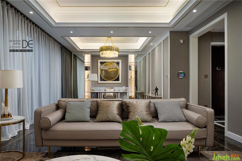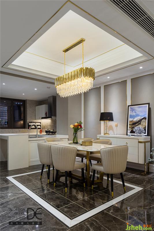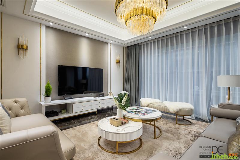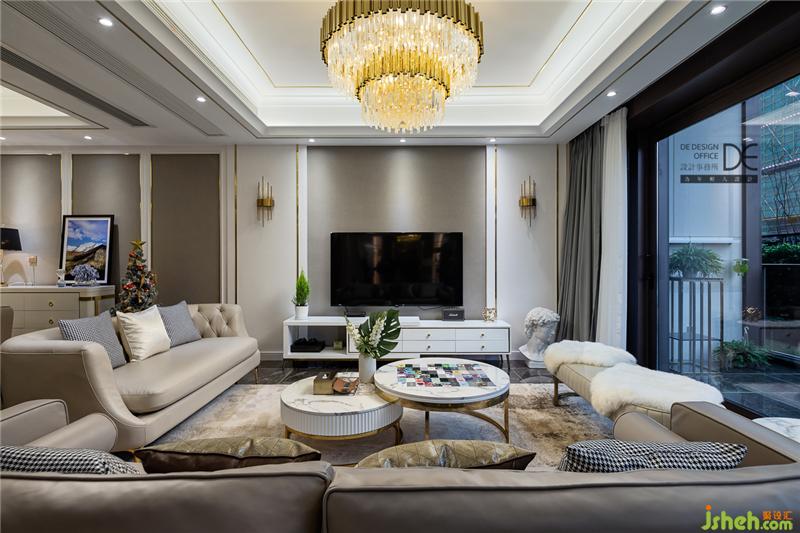 設(shè)計師將金色的點綴合理分布在整個空間內(nèi),客廳通鋪黑色紋理地磚加鋪大張地毯,與璀璨吊燈上下呼應(yīng),盡顯輕奢風(fēng)范。