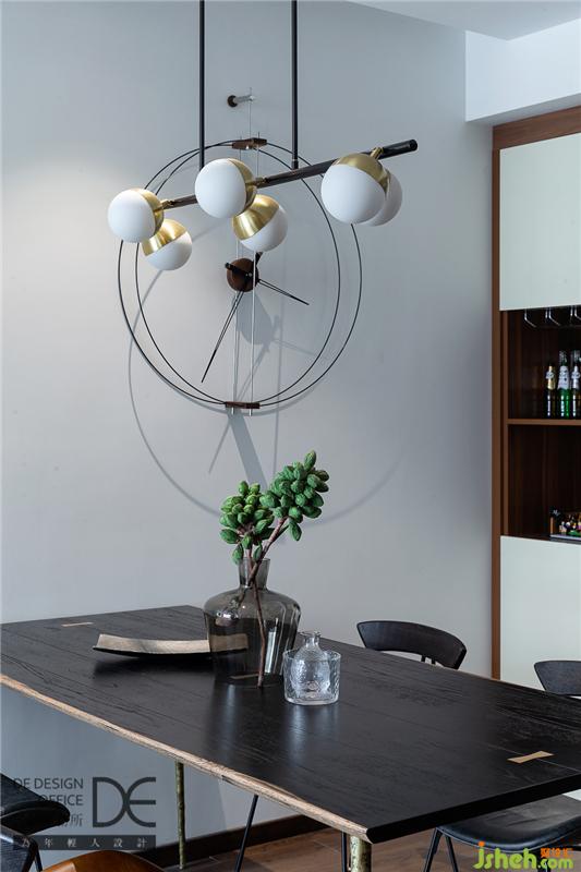 重慶室內(nèi)設(shè)計(jì)師選用白色打底,鋪上與家具類似的黑胡桃木色地板,做舊的餐桌為這個(gè)空間帶來(lái)一絲復(fù)古氣息。