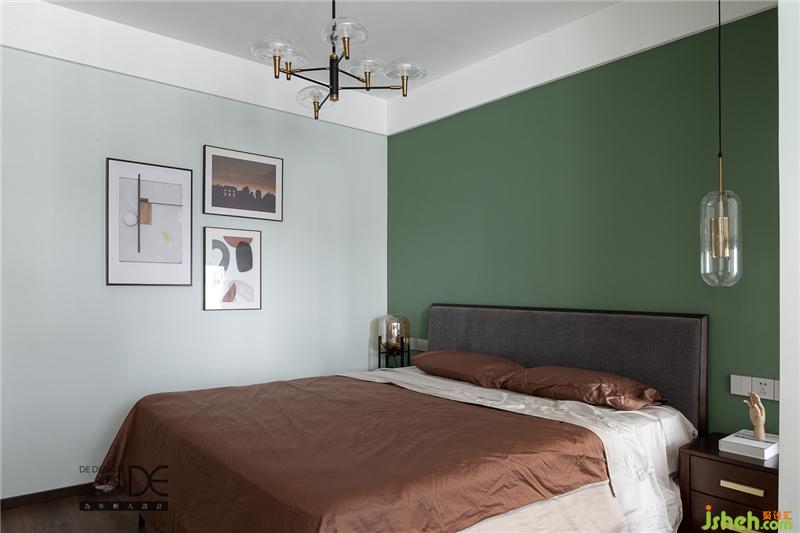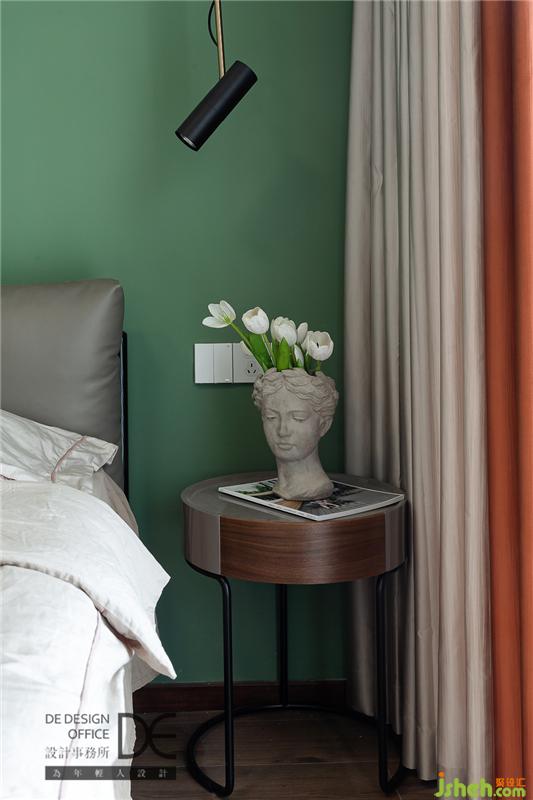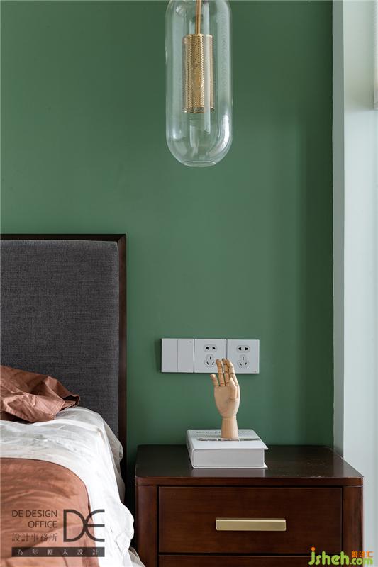 主臥主打復(fù)古調(diào)的綠色,玻璃金屬質(zhì)感的床頭燈與主燈相呼應(yīng),營造精致而不失夢(mèng)幻的睡眠空間。