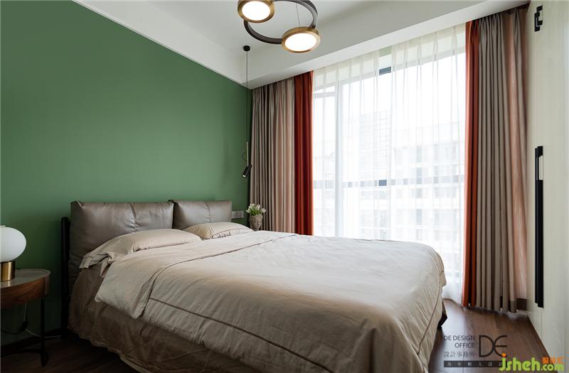 次臥的色彩豐富而不繁復(fù),在大面綠色的襯托下,窗簾的色彩畫龍點(diǎn)睛,讓整個(gè)空間燦爛起來。