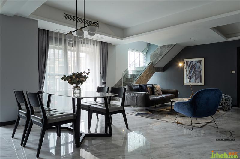 寬敞的簡約風(fēng)客廳,擺上深色沙發(fā)、大理石茶幾、抽象掛畫、金屬落地?zé)簟O(shè)計師用最簡單的元素,塑造一種柔和、平靜、穩(wěn)重的視覺感受。樓梯間引入的光影,更是讓整個空間豁然開朗起來。