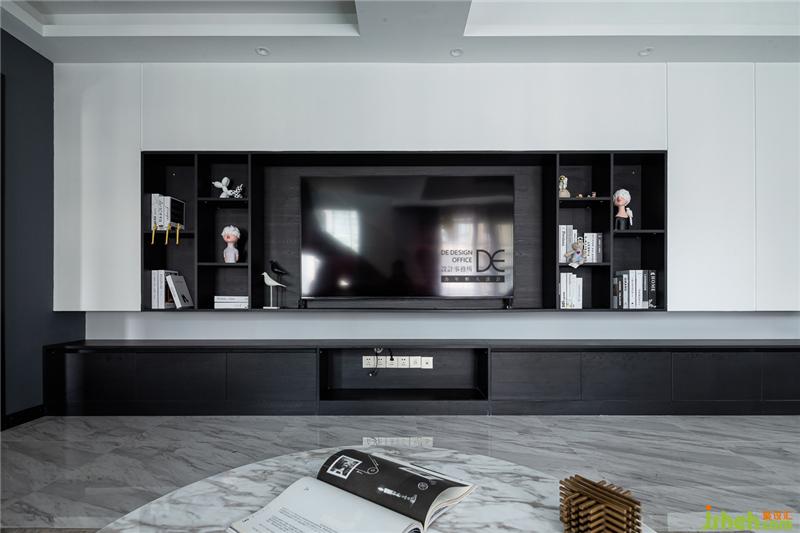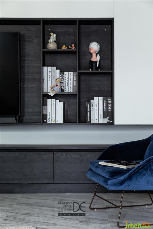 電視背景墻選擇了“白+黑”的色彩搭配,提升空間的高級感。同時,設(shè)計師用整墻壁柜,彌補了儲物空間的不足。