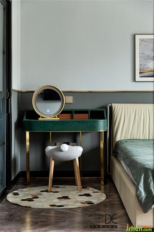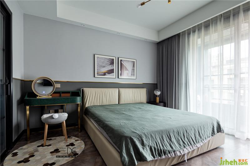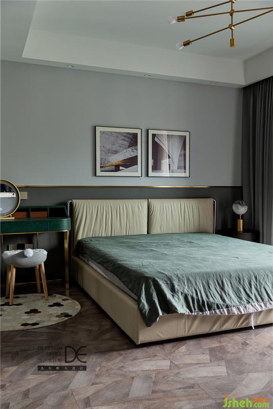 主臥以灰色為基調(diào),加入綠色點(diǎn)綴,清爽而溫暖。背景掛畫與地面紋理相照應(yīng),和諧舒適感油然而生,金屬線條的裝飾,更是為這個(gè)空間添色不少。