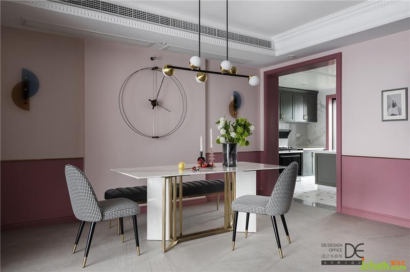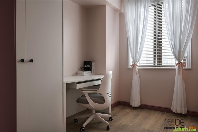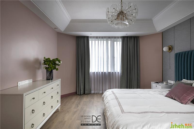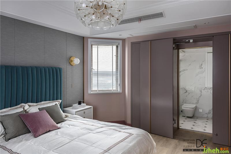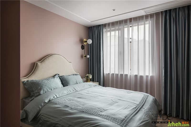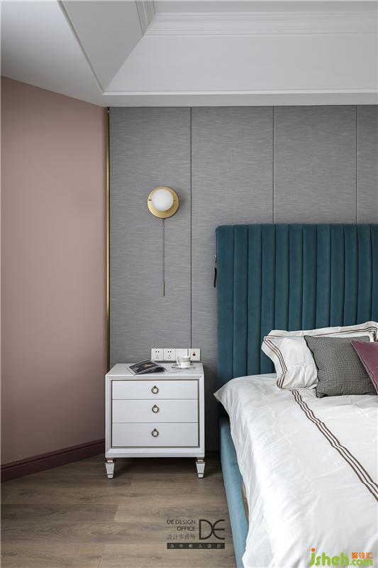 主臥床頭背景墻采用布藝硬包和藍(lán)色軟包相結(jié)合,讓主臥空間顯得大氣,布藝的材質(zhì)讓空間更加柔軟。黃銅色的收口條和粉色乳膠漆墻面和整個空間的色調(diào)相呼應(yīng)。