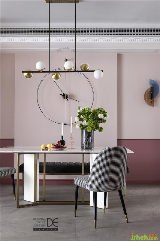 金屬和石材碰撞的餐桌使整個空間更具品質(zhì),鮮花和燭臺的加入,增添了進(jìn)餐時的生活儀式感。