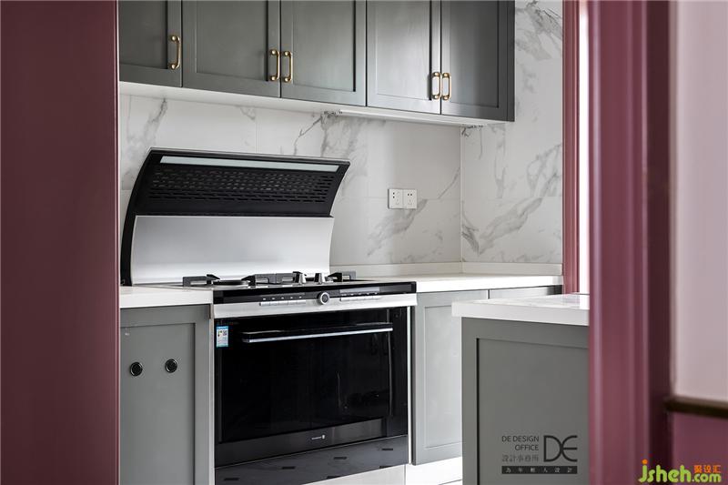 半開放式廚房鋪滿爵士白花紋墻磚,提升空間質(zhì)感。集成灶、蒸箱,以及島臺上的洗碗機水槽等,幫助業(yè)主解放雙手,享受生活。