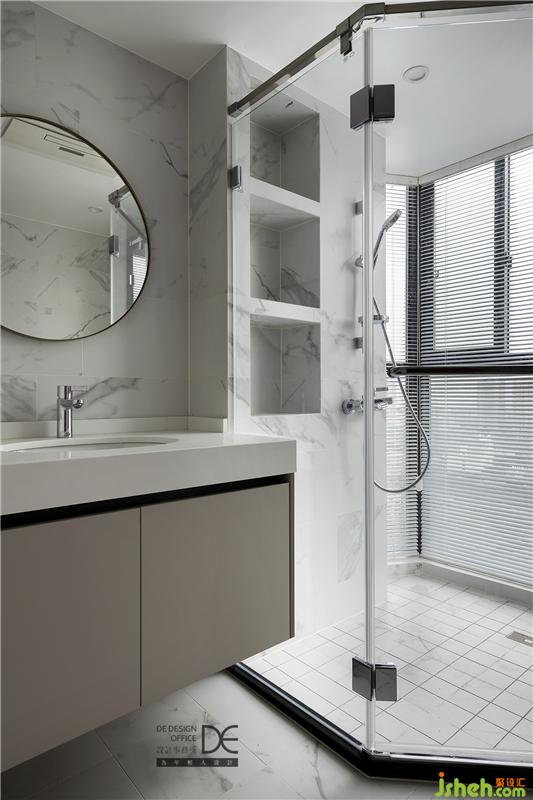 衛(wèi)生空間也同時承擔(dān)了儲物功能,在滿足衛(wèi)生間舒適功能的基礎(chǔ)之上,巧妙的運用浴室柜以及壁龕來開辟儲物新渠道。淋浴間自然采光充足,淋浴體驗極佳。
