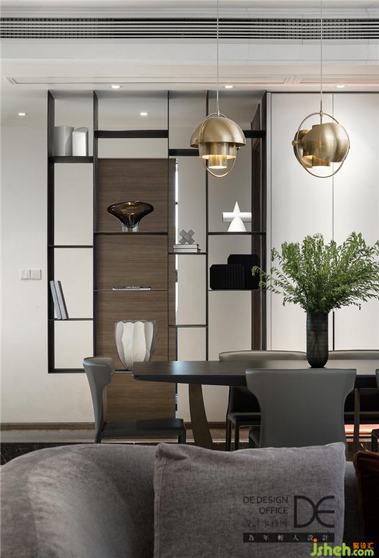 餐廳燈具與客廳金屬燈具相呼應(yīng),黑白灰色調(diào)自帶高級(jí)感,懸空造型的展示架增加了客餐廳收納的同時(shí),也增添了幾分藝術(shù)氣息。