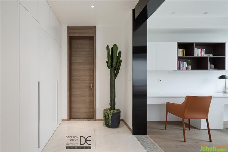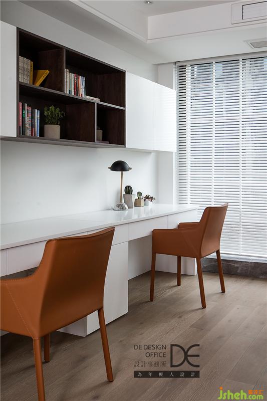 開放式書房位于二層空間,大面積的白色與過道的整面櫥柜相呼應,清新綠植、實用雙人桌、復古色單椅等元素相結合,落落大方之余,實用而耐看,營造了滿滿的愜意感。