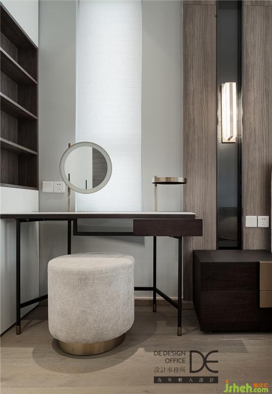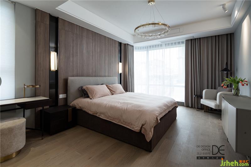 主臥延續(xù)了公共空間的黑白灰色調(diào),自然格調(diào)的木飾面作為背景,與窗簾相呼應,呈現(xiàn)出一個簡單而不失質(zhì)感的睡眠空間。