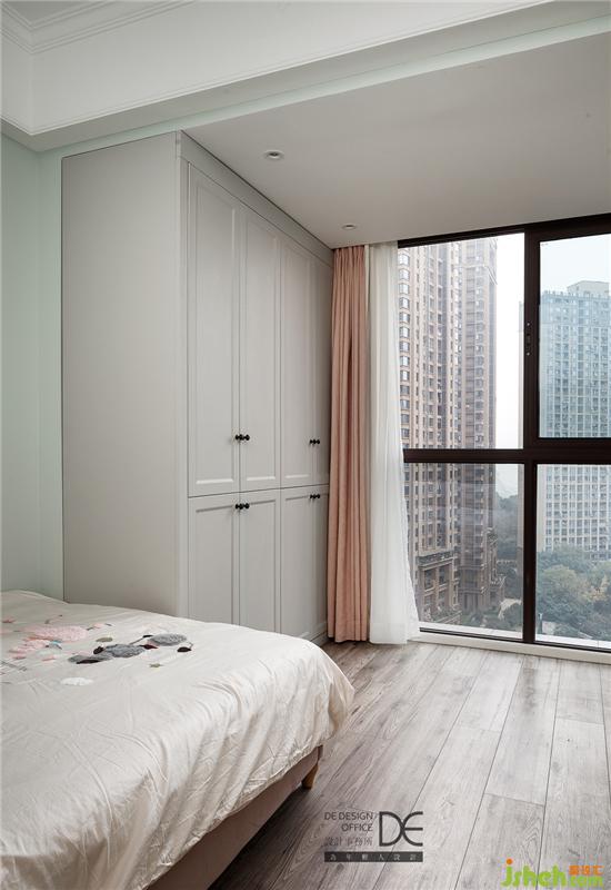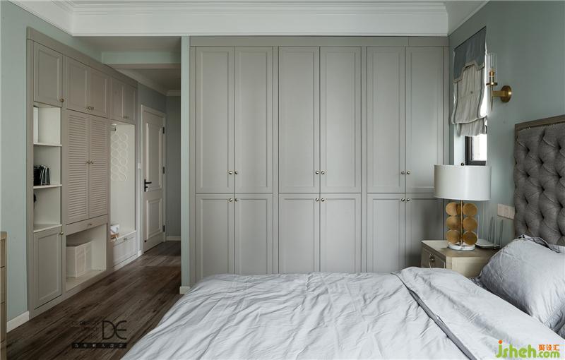 主臥延續(xù)客廳的色調,暖灰色衣柜和綠灰色墻面讓整個空間放松舒適,淺色元素的組合搭配,為業(yè)主營造了一個柔和的睡眠空間。