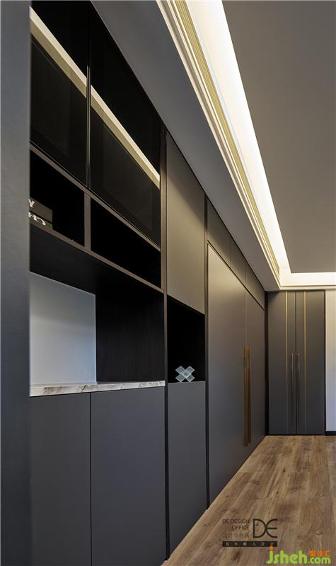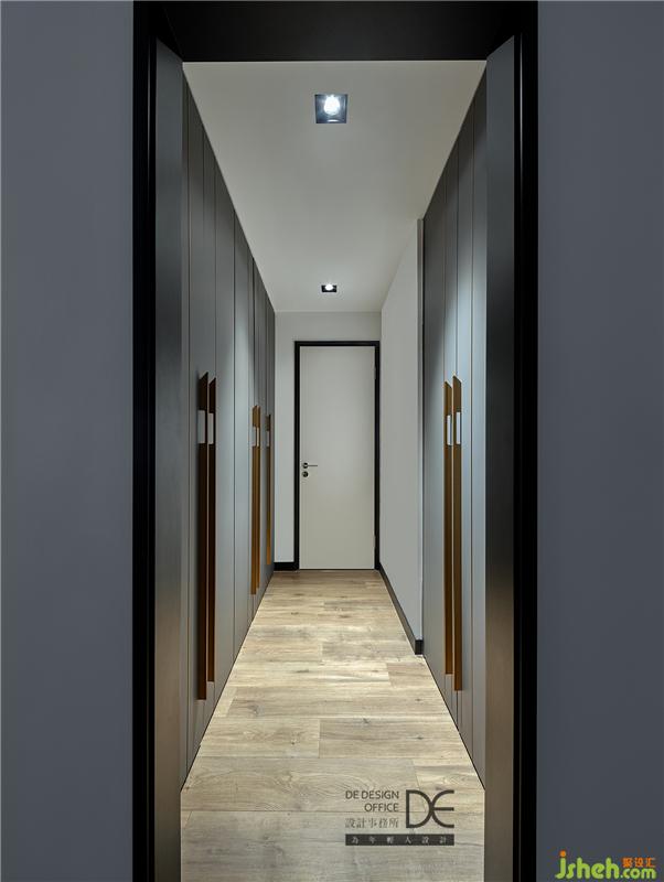 喜歡“買買買”的業(yè)主,單獨的衣帽間肯定是不能少的。主體白色和灰色的色彩搭配簡單干凈,輔以藍灰?guī)Ы饘倬€條的衣柜門板,簡單而不失質(zhì)感。在燈光設(shè)計方面,為了給業(yè)主營造干凈整潔的環(huán)境,沿用無主燈設(shè)計。