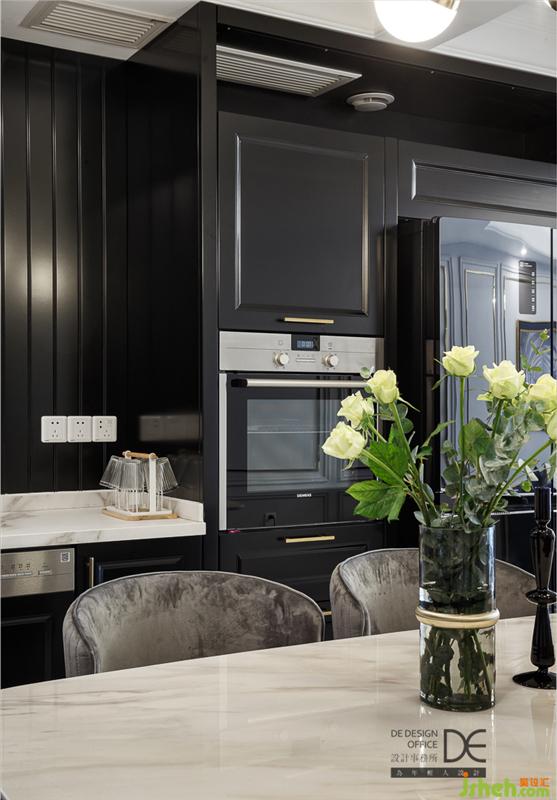 廚房的黑色櫥柜,沉穩(wěn)而干練,黑色中點(diǎn)綴著金色燈具,像是在歲月沉淀的靜郁里綻放出的搖曳生輝的花。