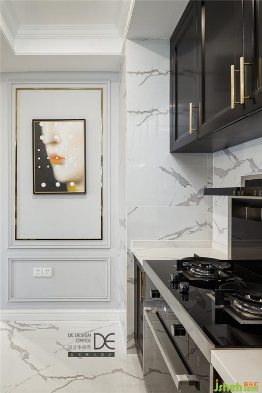 開放式廚房是最能拉近家庭成員在生活過程中的交互關(guān)系的,每位家庭成員都可以或多或少的參與到烹飪過程中,大人們擇菜、烹飪,小朋友在一旁玩耍,盡享三代人的天倫之樂。溫柔浪漫的女主人不忘在廚房也掛上一幅唯美的畫,飯菜香一點(diǎn),生活甜一點(diǎn)……