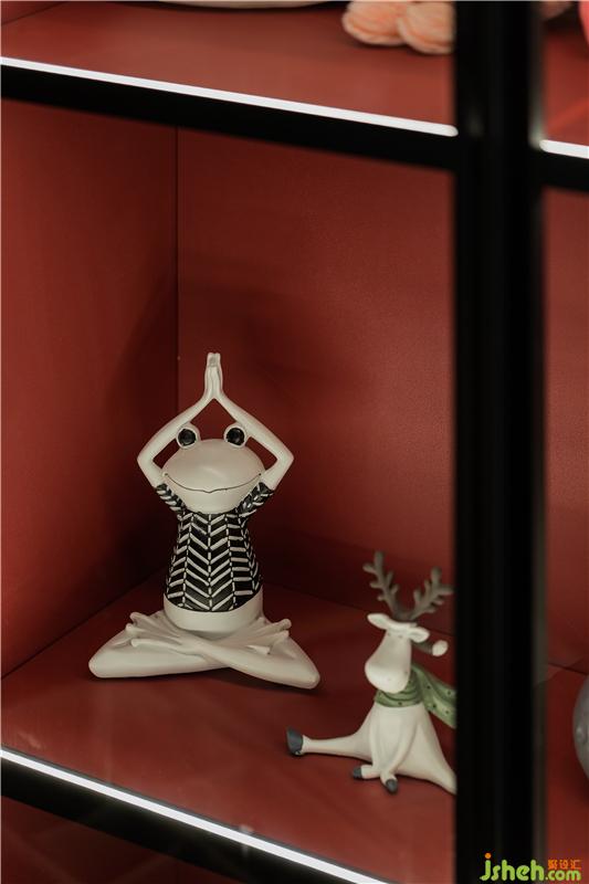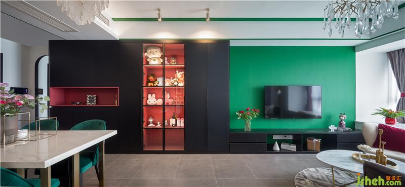 客廳紅色+黑色的柜體與綠色的電視背景墻形成鮮明對(duì)比。在很多人的認(rèn)知中,紅色與綠色的搭配總有一種俗不可耐的味道,然而紅配綠又是自然界最普遍的組合,一個(gè)鮮艷且熱烈,一個(gè)流淌著生命力~