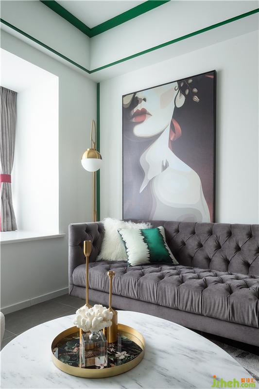 啞光淺灰地磚通鋪了廚房客餐廳,干凈利落的空間擺上一塊小巧的地毯,與圓形小茶幾相呼應(yīng),布置上灰色布面沙發(fā),HOLD住客廳大面積的綠色。沙發(fā)背景墻以掛畫(huà)和落地?zé)艚Y(jié)合的方式,呈現(xiàn)出一種高級(jí)的精致感。