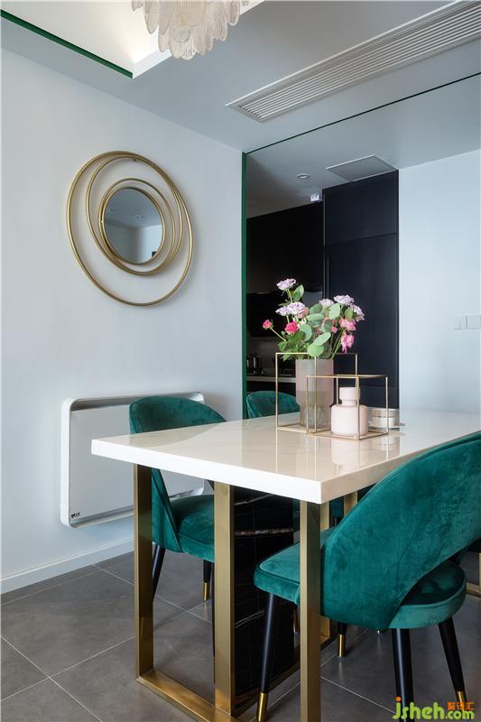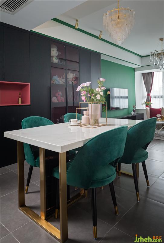 餐廳與客廳連通的格局,讓空間顯得敞亮。金屬點(diǎn)綴的餐桌搭配墨綠色的餐椅,布置上精致的花瓶,讓用餐氛圍顯得頗有情趣。