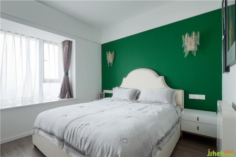 臥室延續(xù)客廳的綠色調(diào),搭配白色大床和柜體,整個(gè)睡眠空間清新舒適,彰顯著如春天般的生機(jī)與活力。