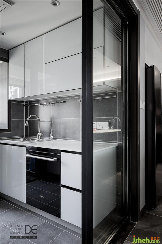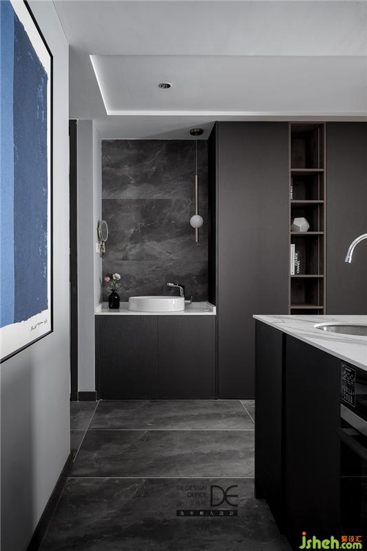 深灰瓷磚搭配白色烤漆柜面,廚房的配色簡單而純粹。在這樣一個(gè)干凈的廚房里,期待業(yè)主做出豐富可口的美食,為這個(gè)空間帶來更多生活氣息和溫馨色彩。