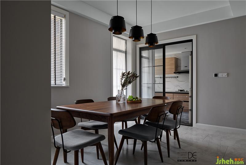 復(fù)古原木色的餐桌搭配深色的吊燈讓空間迅速沉穩(wěn)下來,黑色邊框玻璃滑門讓擴大之后的廚房顯得更加通透,空間中的黑色線條搭配自然系木紋的櫥柜柜門,讓現(xiàn)代簡約的空間又增添了一份時尚感 。