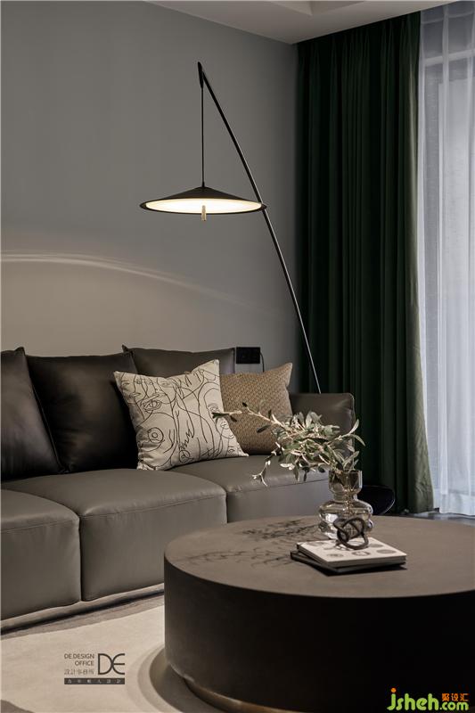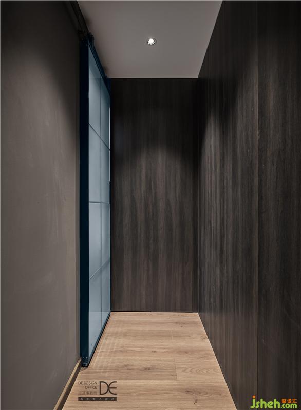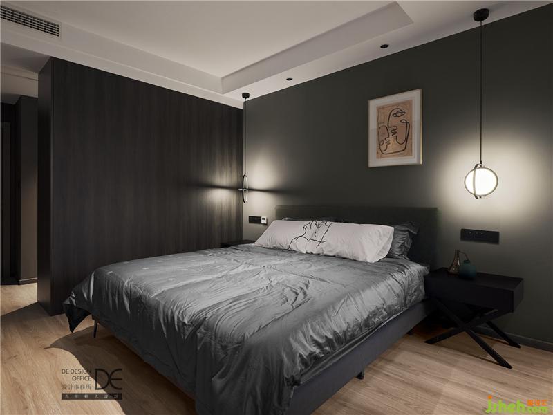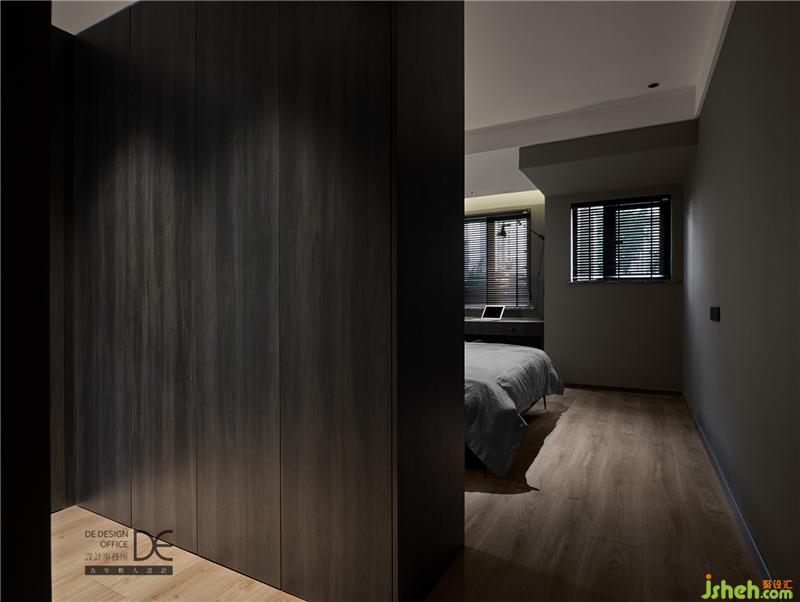 于是,入目即是一眼望到底的黑木紋色柜子,深灰色的乳膠漆,黑色的開(kāi)關(guān)面板和床頭柜,搭配上暖木色的地板,一暗一亮,張弛有度,既中和了黑色帶來(lái)的沉重感,又滿足了業(yè)主的喜好。