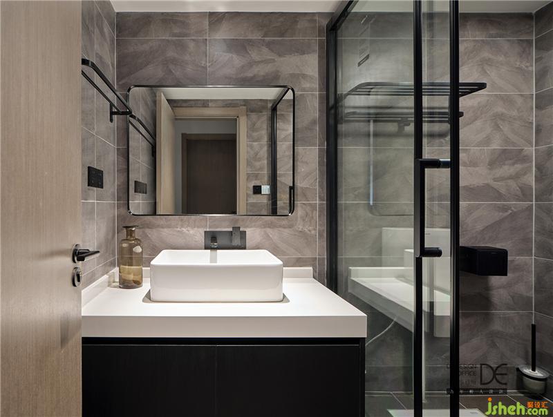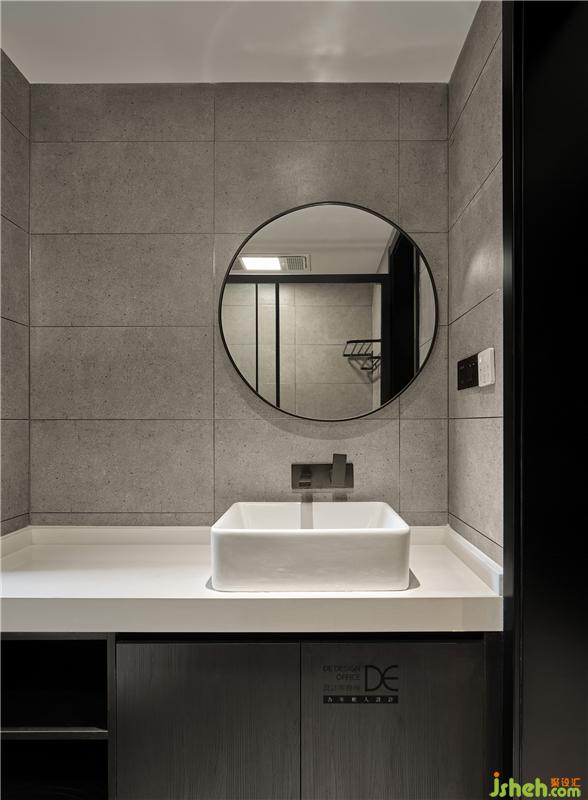 主衛(wèi):中灰色的水磨石墻磚搭配白色石材、白色臺(tái)上盆以及黑色的墻排龍頭,空間的黑白灰感覺(jué)恰到好處。