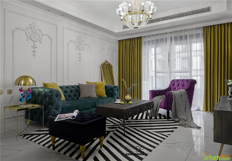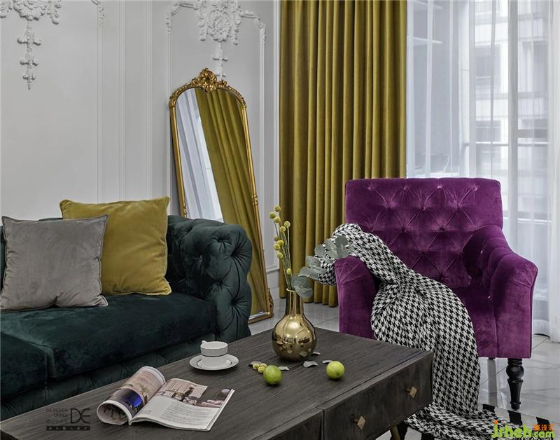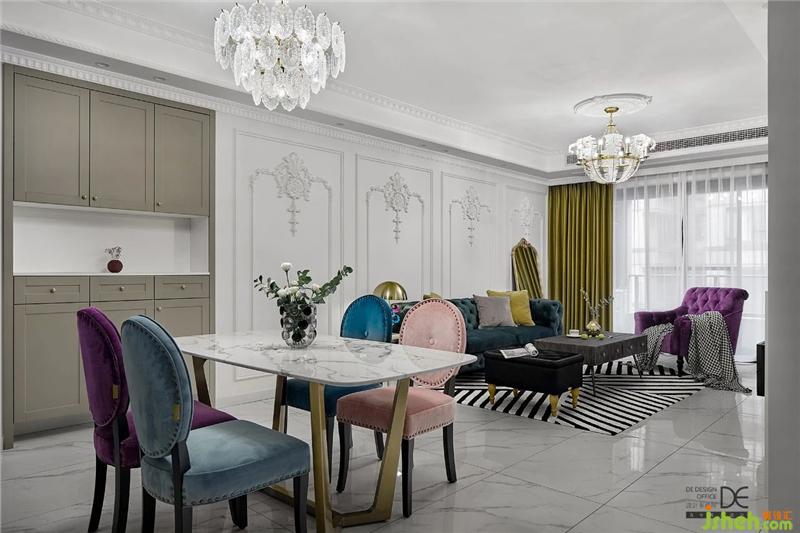 為了保證整體空間的層高,客廳采用的是邊吊,沒(méi)有復(fù)雜的造型,搭配造型吊燈;爵士白大理石地面搭配著墨綠色和紫色的沙發(fā),讓整個(gè)空間一下就變得非常靈動(dòng)。