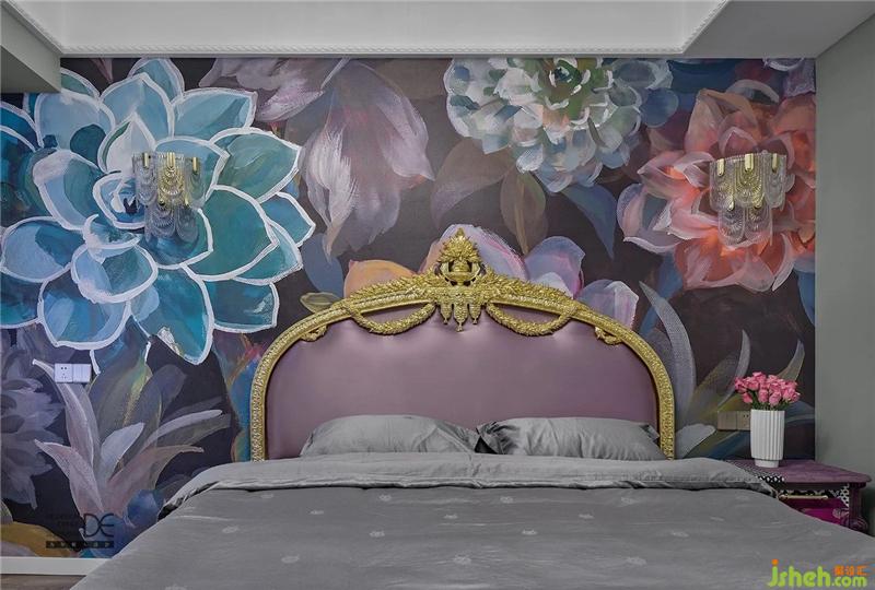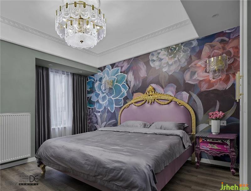 主臥采用了非常有質(zhì)感且立體的壁紙畫,與床品色彩一致。為了讓色彩看上去更協(xié)調(diào),側(cè)邊墻面就用了一款低調(diào)沉穩(wěn)的灰綠色來襯托。