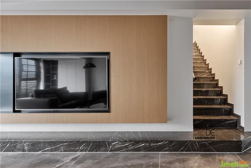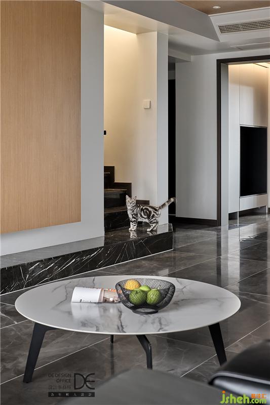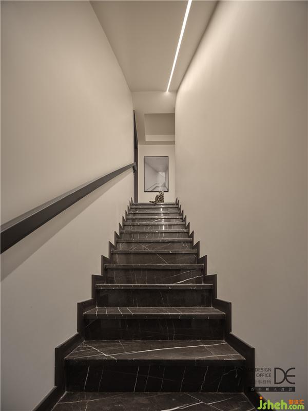 樓道大面積鋪滿白色。對(duì)于這種直跑樓梯同時(shí)兩面為墻的,重點(diǎn)就是如何去除壓抑感,增加空間層次感。而線性光源的加入和定制的黑色亞光扶手就很好地承載了整個(gè)空間。