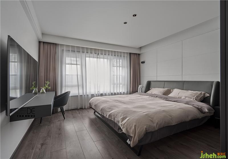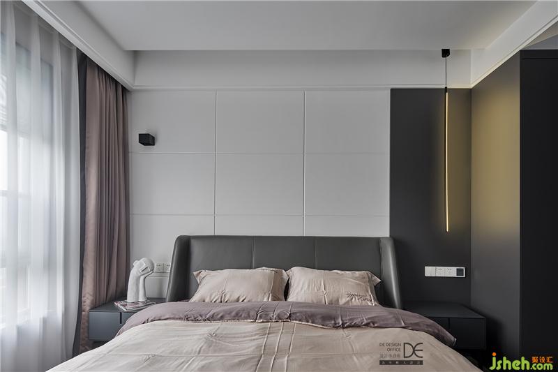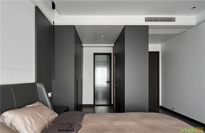 主臥的第一個細(xì)節(jié)就是進(jìn)門右手邊柜子的設(shè)計。為了打破進(jìn)門壓抑感,把其中一部分柜子做了開口架處理,衣帽間內(nèi)側(cè)做了一個背靠背的開口架處理,美觀實用。