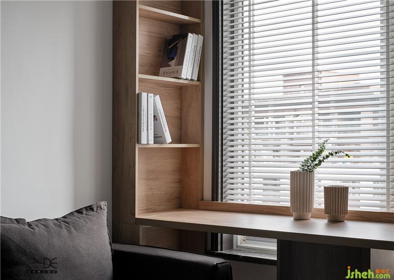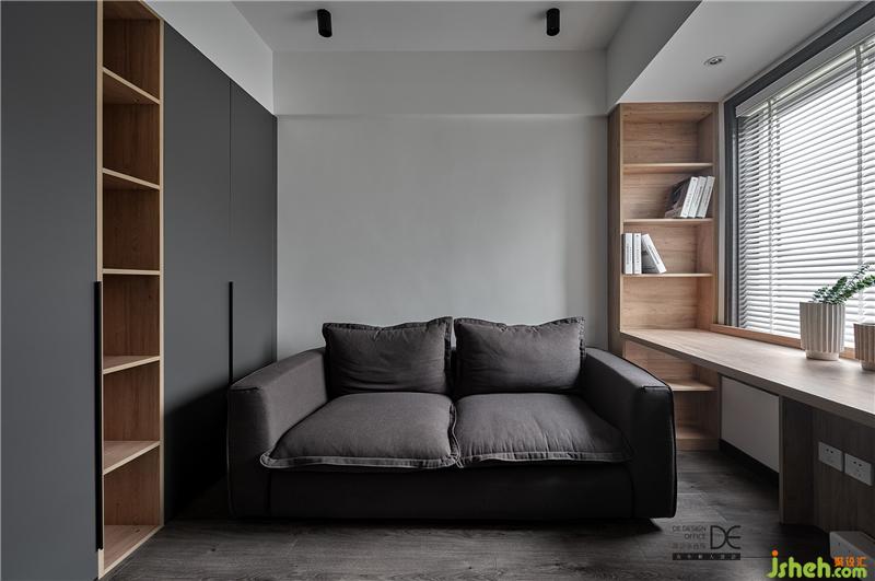 書房區(qū)域融合灰色和木色,溫馨又帶有一點精致。儲物柜及書架的加入讓其他區(qū)域的儲物得到了延續(xù)。平時打游戲累了,還可以躺在沙發(fā)上小憩一會。