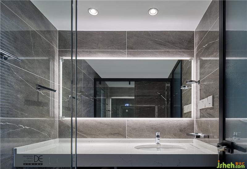 衛(wèi)生間色調(diào)就相對干凈,頂面白色,墻面地面灰色,讓頂面的燈光作為區(qū)域的點睛之筆。