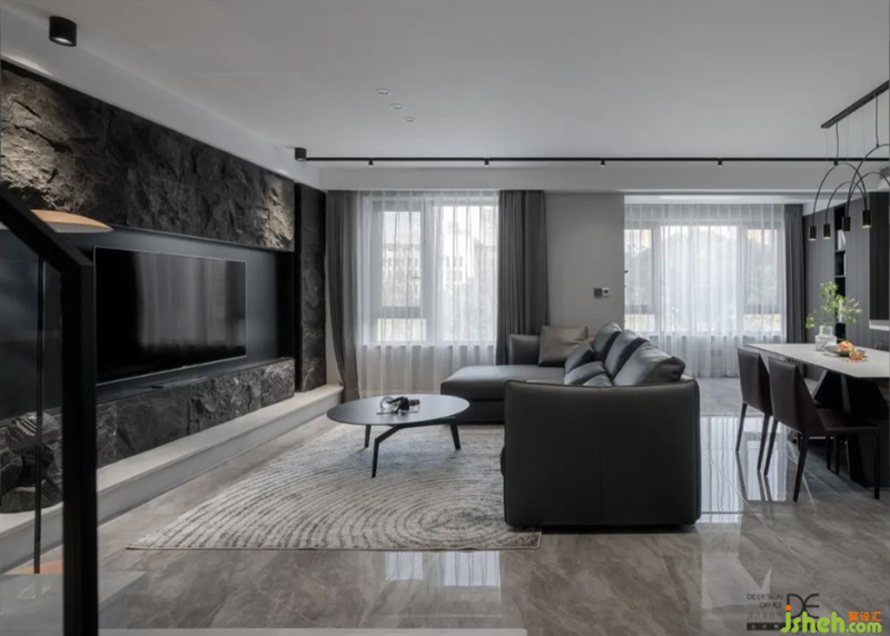 客廳和墻頂?shù)脑煨停詫?duì)稱的形式來呈現(xiàn),簡潔的黑色燈槽在墻面得以延伸。