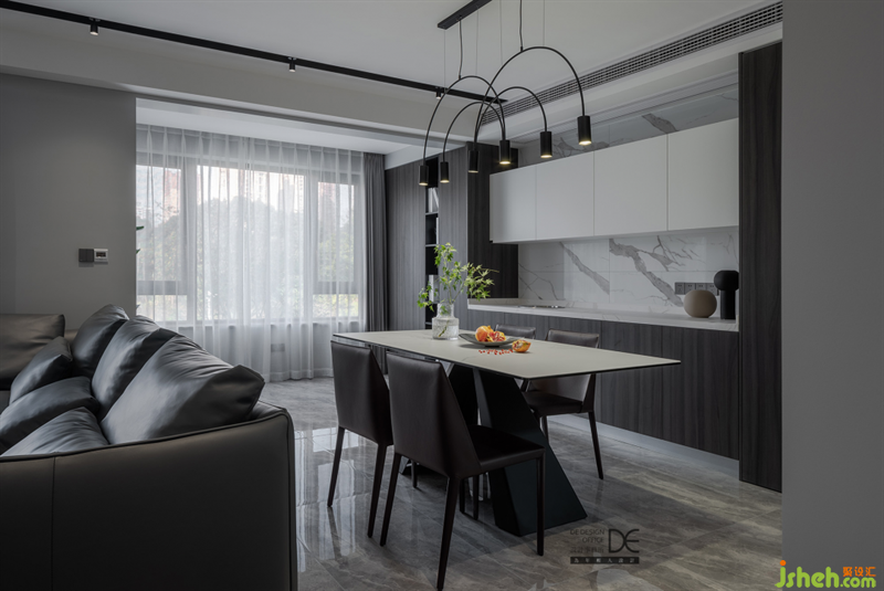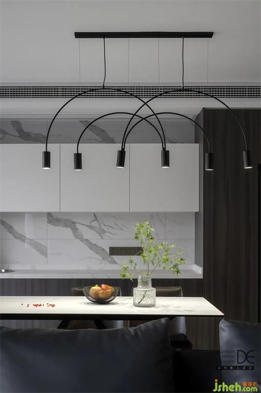 材質(zhì)上沿用統(tǒng)一的深木紋色為主,輔以魚肚白的墻磚和膚面柔和的白色吊柜來調(diào)和深色,簡潔的餐桌、皮質(zhì)的餐椅、溫馨的局部燈光,家該有的質(zhì)感和溫馨得以展現(xiàn)。
