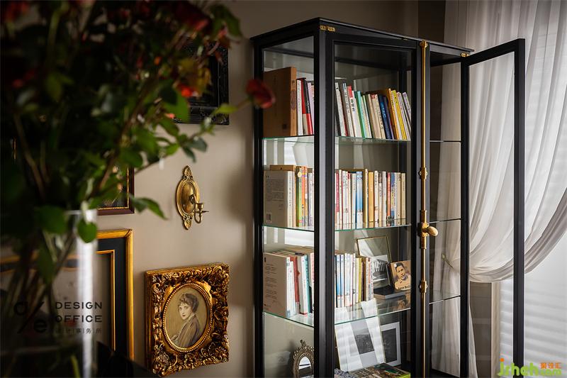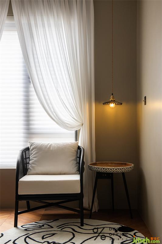 書房的一角,復(fù)古的黃銅吊燈旁置放了一把黑色實(shí)木椅,充滿質(zhì)感與復(fù)古,這些都是業(yè)主旅游所淘回來(lái)的「寶藏」,地毯抽象的線條讓視覺無(wú)限延展。坐在燈下,氤氳的暖色,配合自然的光線,烘托出意味深長(zhǎng)的文藝片故事,讓人逐漸地釋放出更多的情緒。
