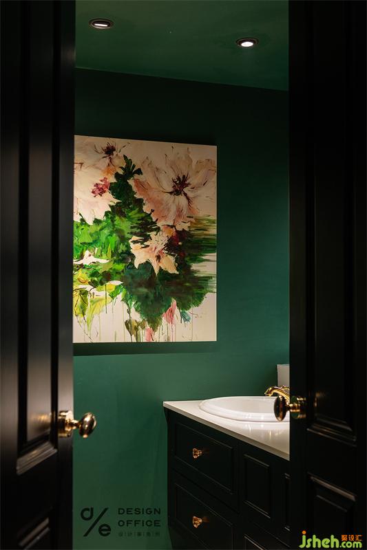 推開浴室Vintage 質(zhì)感的黑色木門,一種華麗的眩暈感撲面而來(lái),獨(dú)特的墨綠色的浴缸讓人過目不忘,蒲葵帶來(lái)的綠意從進(jìn)入的那一刻便散發(fā)著猶如海邊度假般的悠閑氣息。