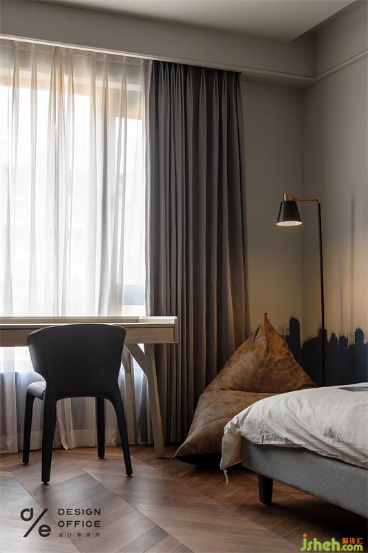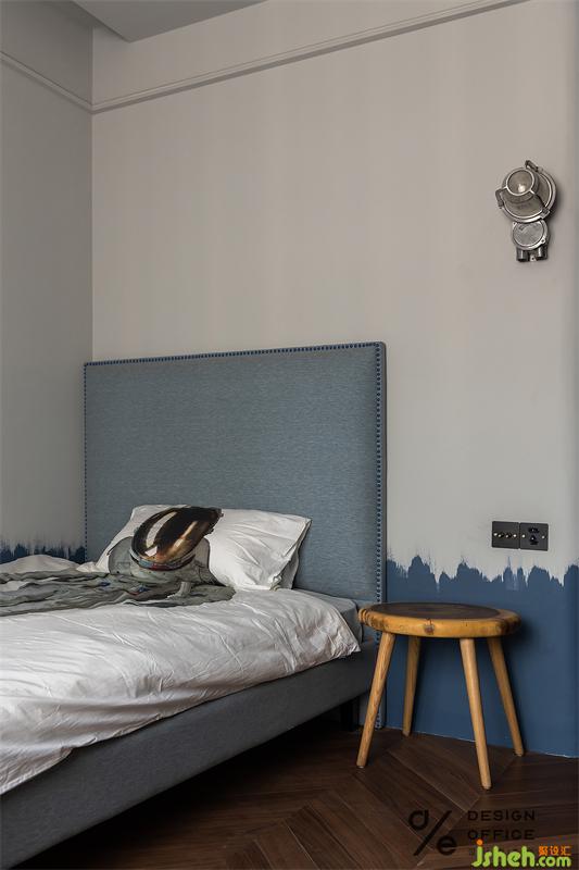深藍(lán)色不規(guī)則涂鴉墻面讓整個(gè)臥室充滿了藝術(shù)化的極簡(jiǎn)趣味,搭配布藝的床頭更具時(shí)尚格調(diào)。極簡(jiǎn)的桌椅和復(fù)古情懷的落地?zé)艚幌嗪魬?yīng),泛黃的燈光映照著鮮活靈動(dòng)的青春氣息。