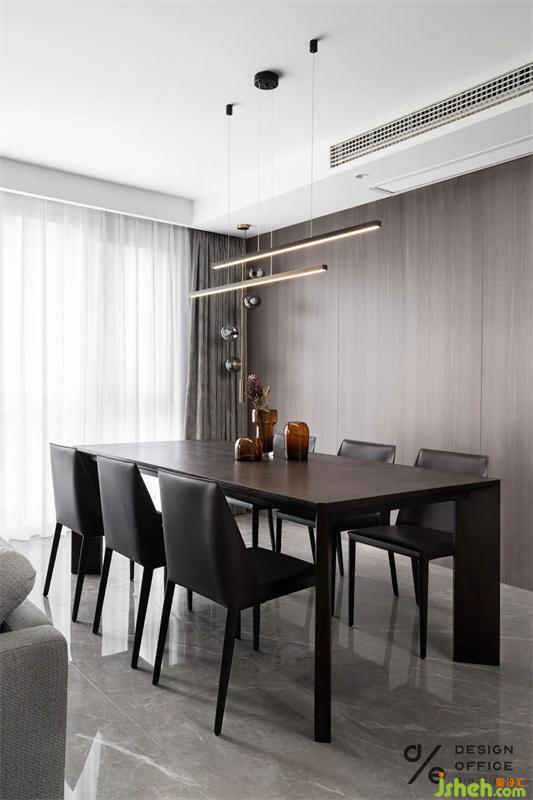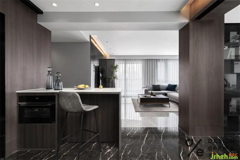 開放式廚房與餐廳相鄰,設(shè)計師以簡約布置勾勒現(xiàn)代精致的生活情景。