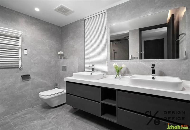 主衛(wèi)在品質(zhì)舒適上面花了很大心思,滿足了業(yè)主提出的雙臺(tái)面盆的要求,同時(shí)留出了超大的淋浴區(qū),做好干濕分離。